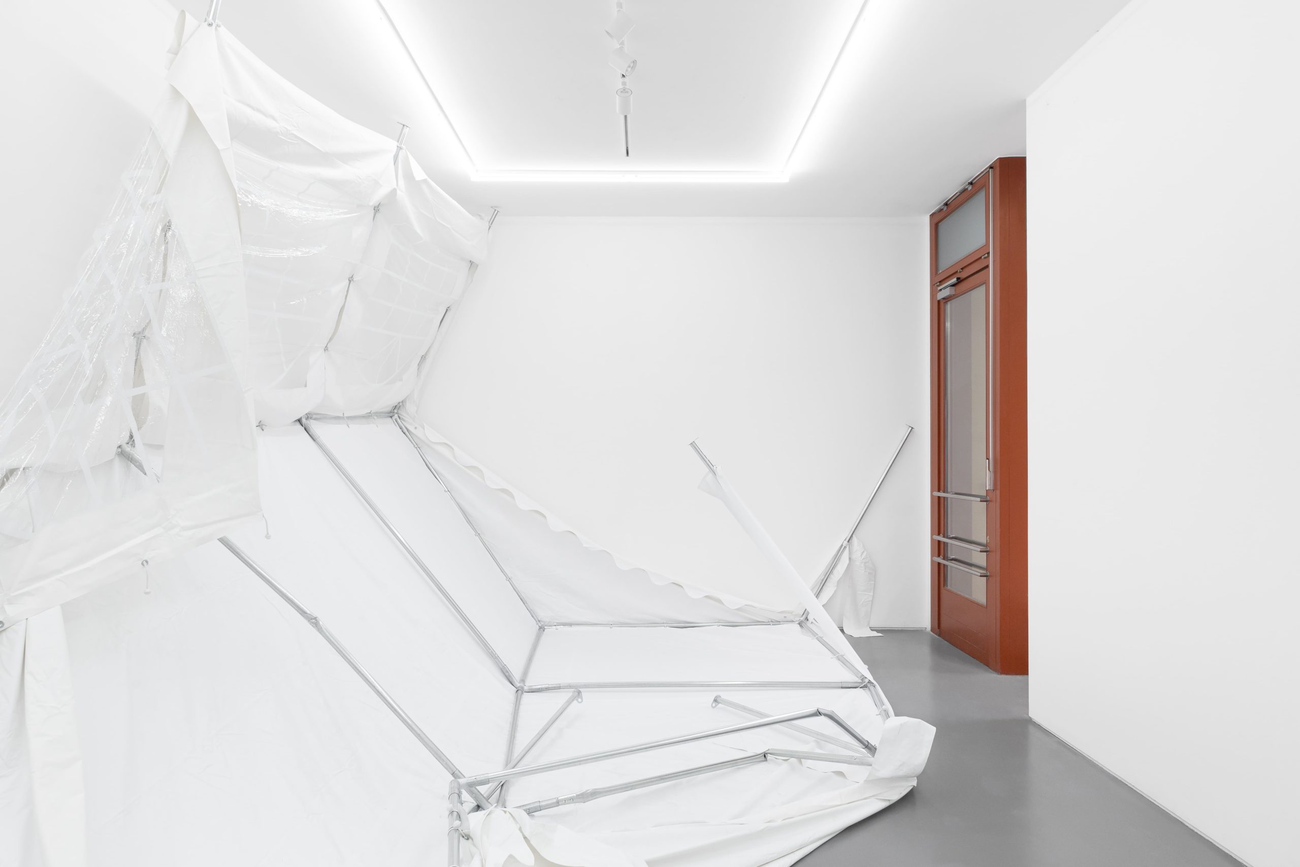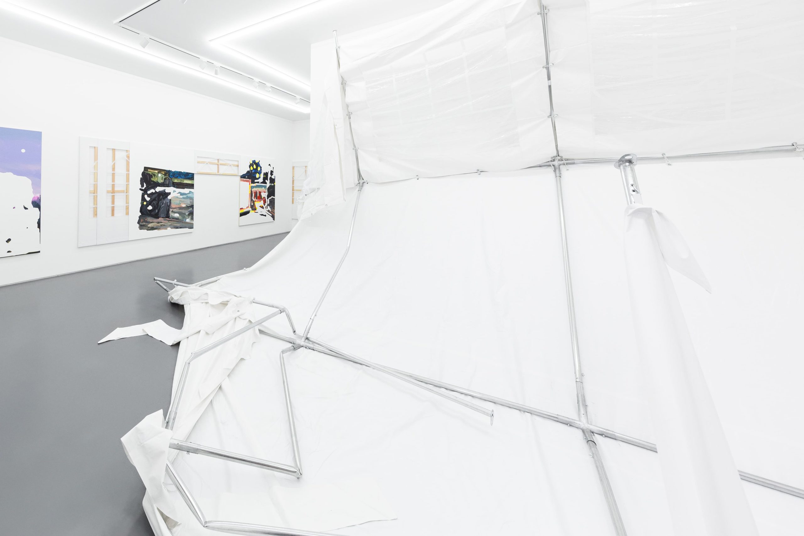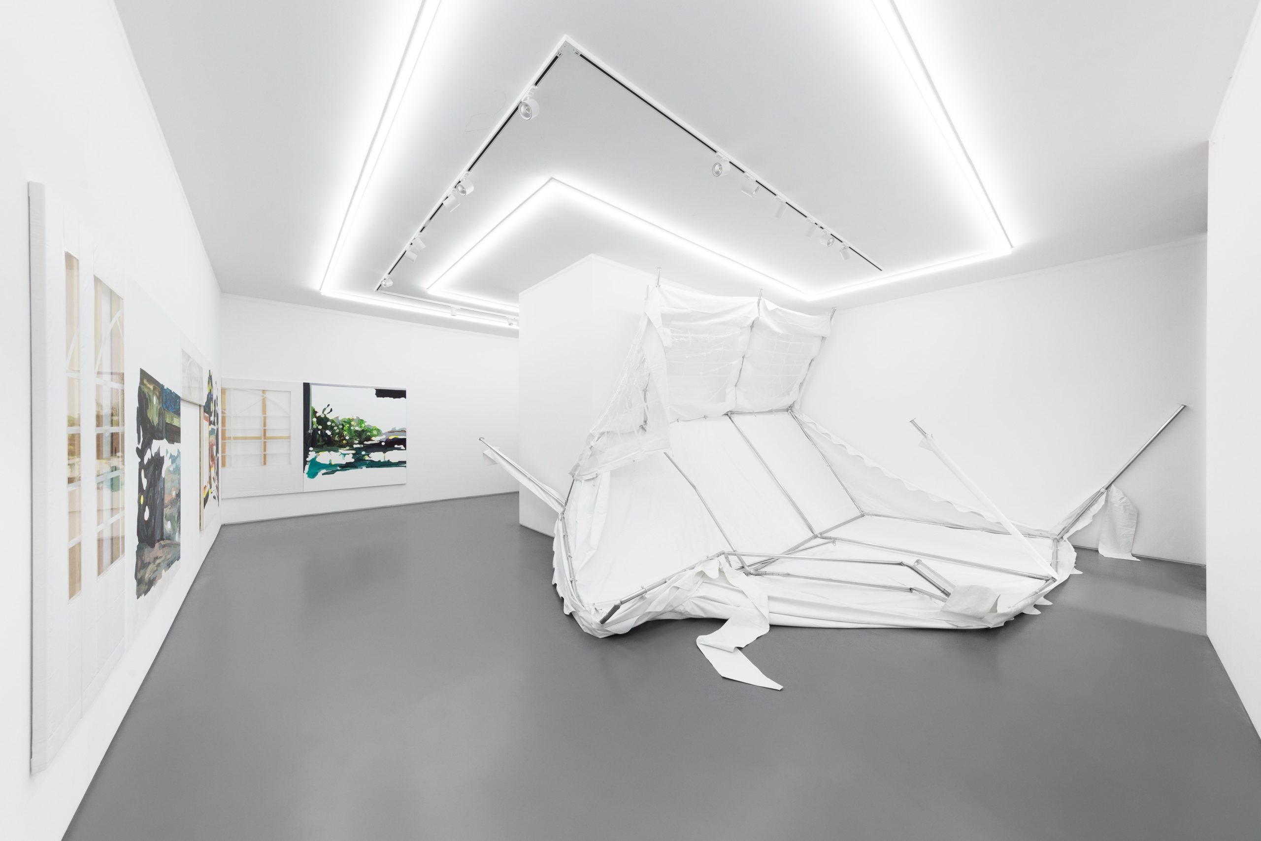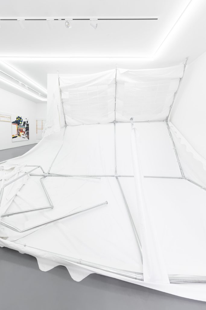 In his new exhibition Tipping Point, Max Geisler presents a multifaceted body of work that moves between painting, sculpture, and installation. The starting point is a large-scale, site-specific installation: a deformed party tent made of steel pipes and PVC tarps spans the space, acting both as a sculptural element and a conceptual framework. It becomes a resonance chamber for Geisler’s exploration of painting as a spatial, corporeal, and psychological experience.