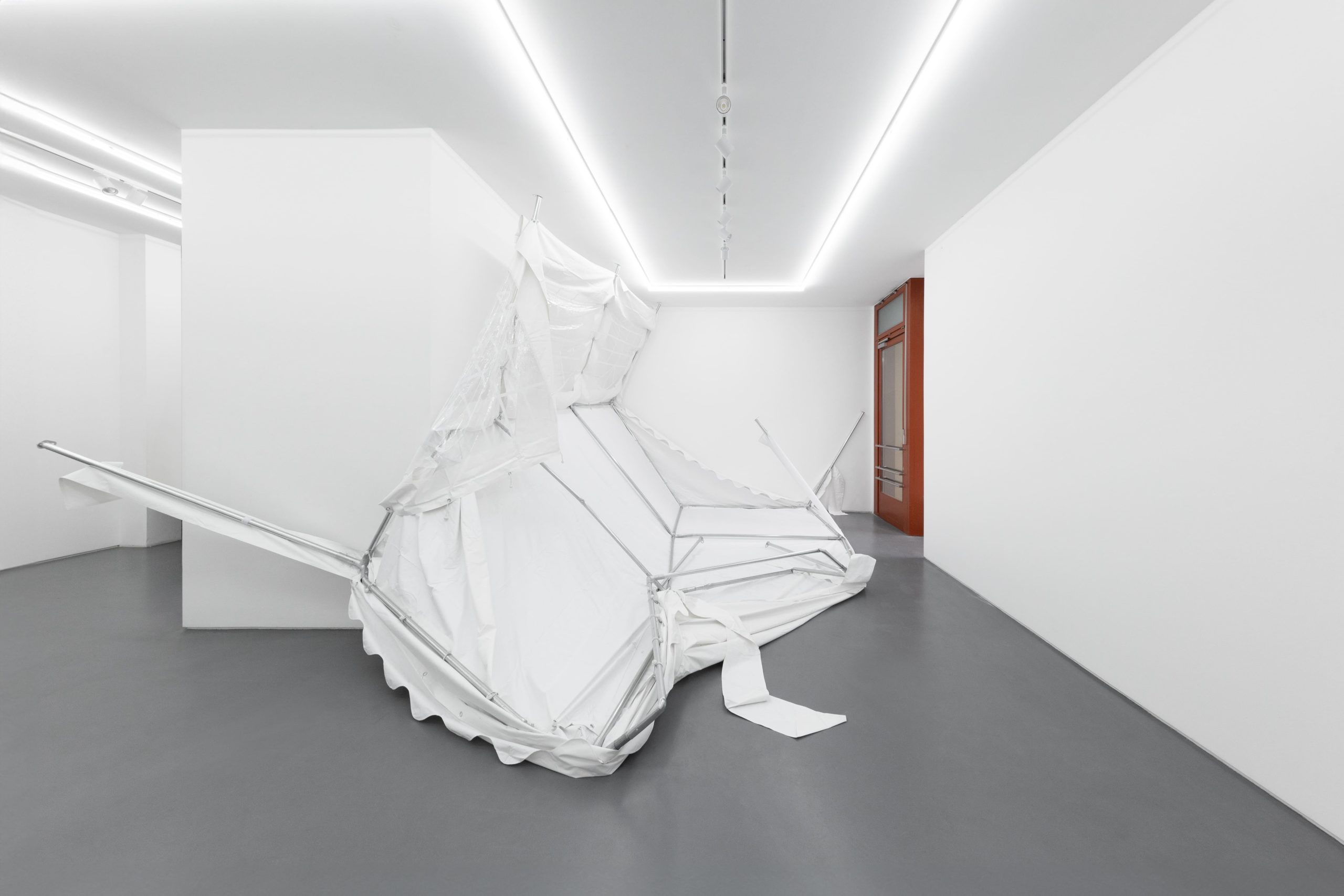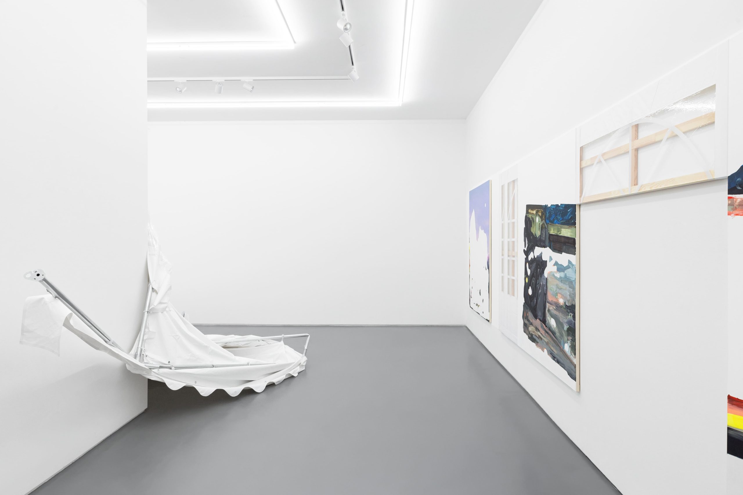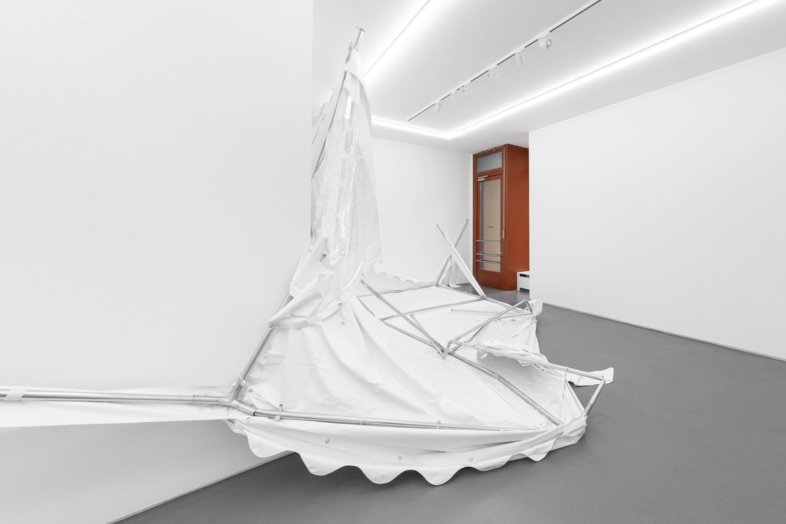 In his new exhibition Tipping Point, Max Geisler presents a multifaceted body of work that moves between painting, sculpture, and installation. The starting point is a large-scale, site-specific installation: a deformed party tent made of steel pipes and PVC tarps spans the space, acting both as a sculptural element and a conceptual framework. It becomes a resonance chamber for Geisler’s exploration of painting as a spatial, corporeal, and psychological experience.