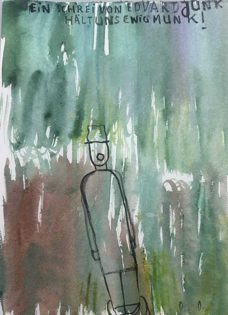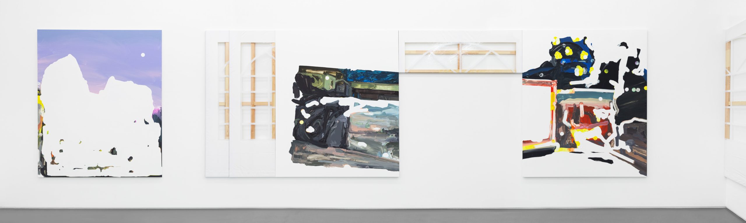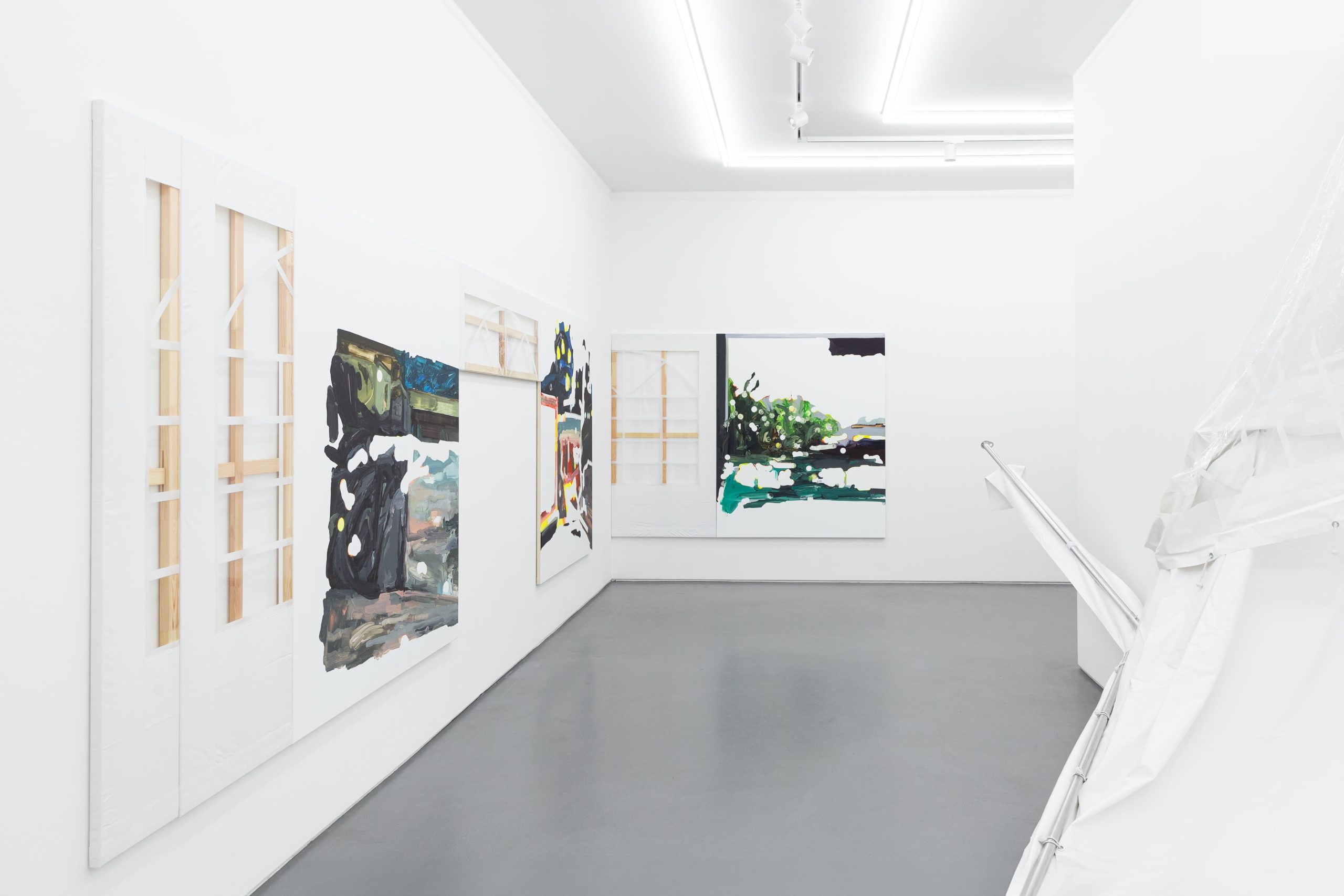 A special role is played by wall works that blur the lines between painting and installation: PVC panels stretched over stretcher frames—sourced from the ‘windows’ of the party tent—mimic the format and depth of the canvases. Installed alongside the paintings in a continuous, ribbon-like sequence with only two deliberate interruptions, these panels suggest a readable sequence, a continuum of painting that also engages with physical space and its perception.