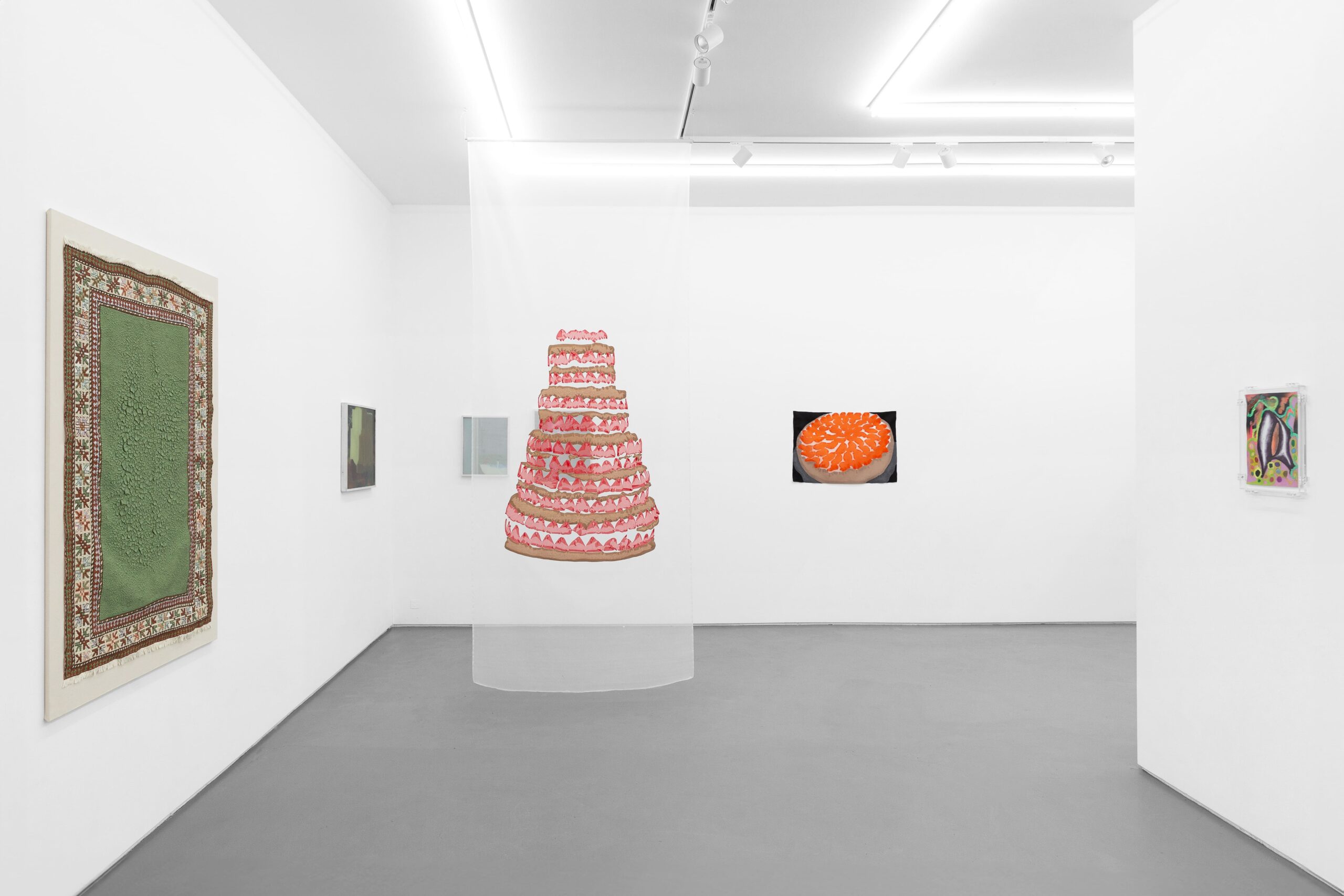 Alrun Aßmus, Erdbeertorte (Strawberry cake), 2024 · Silk organza and silk thread · Image 143 × 97,5 cm / panel 350 × 140 cm, dimensions variable