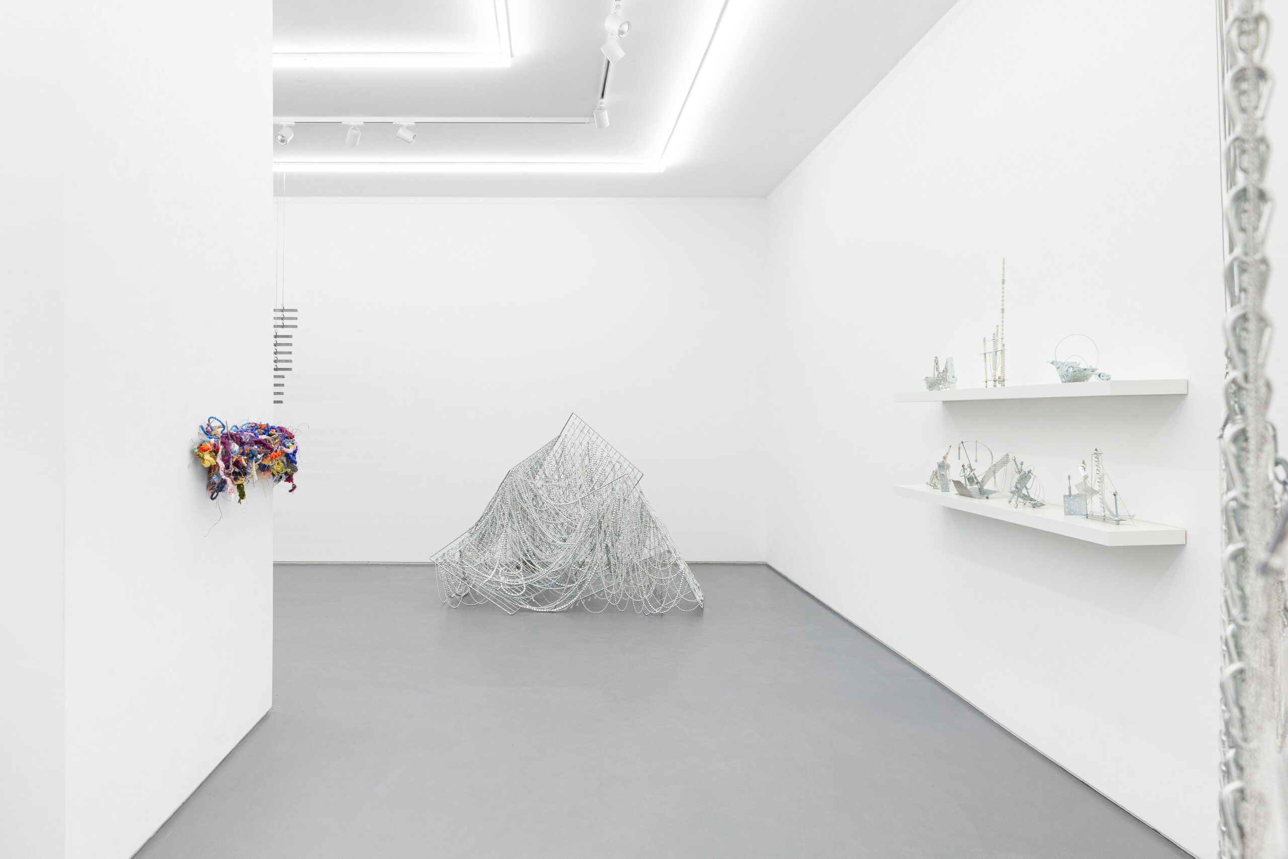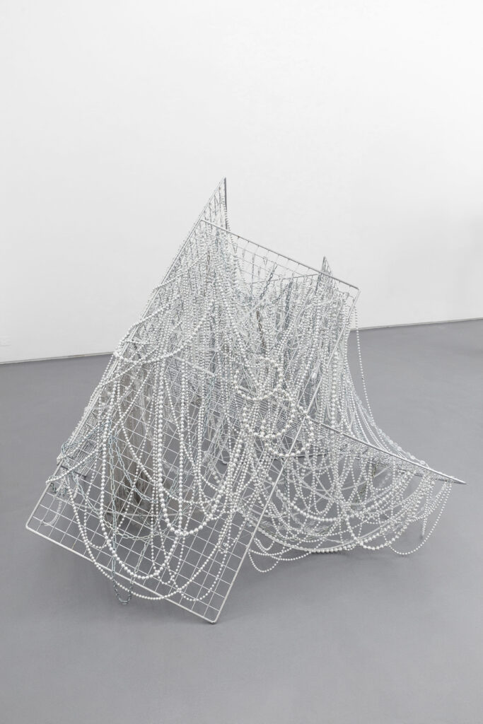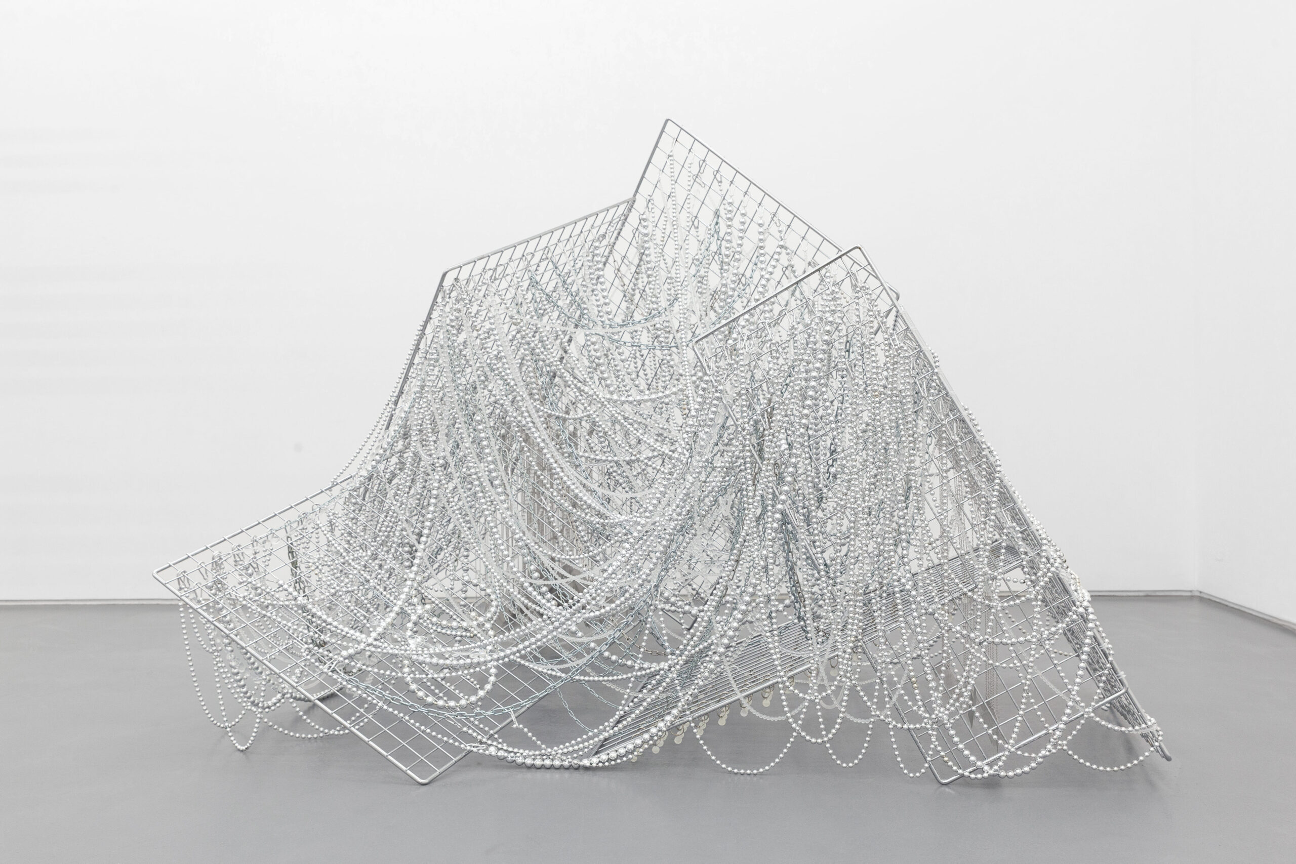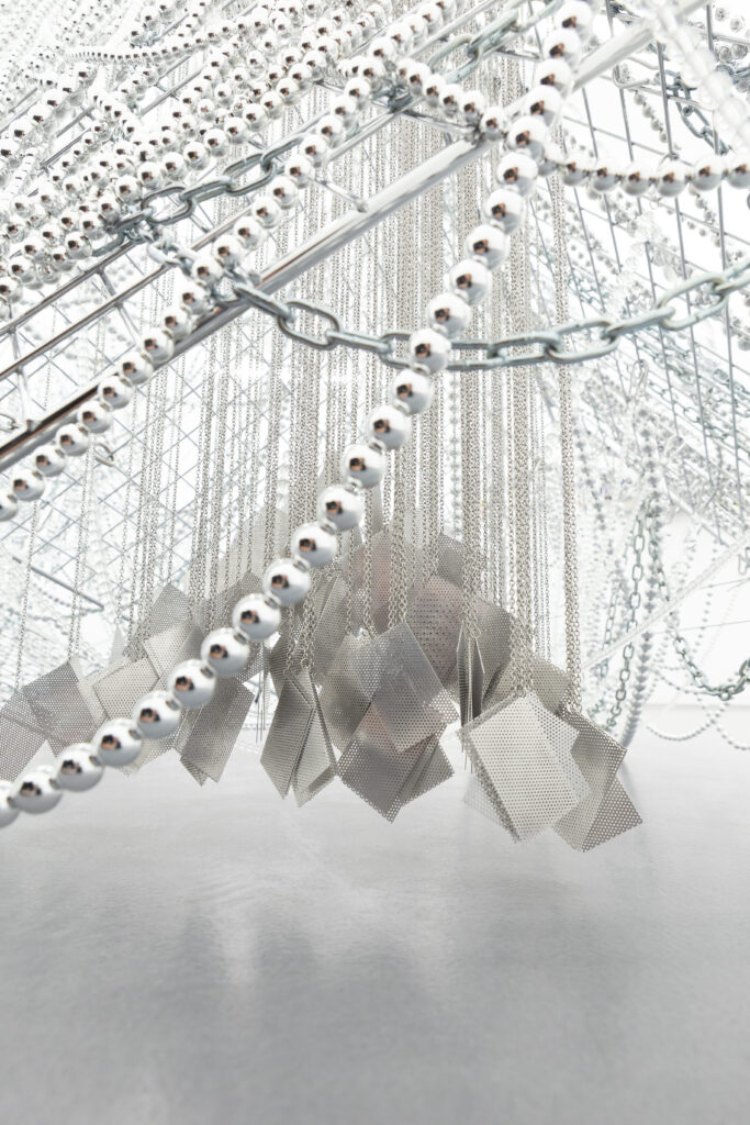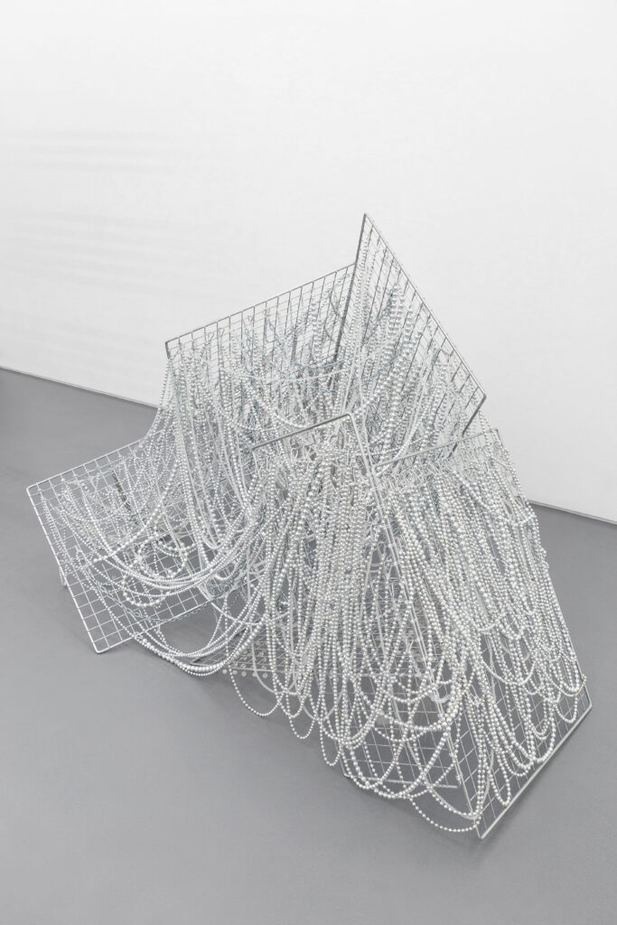 Jusun Lee, System, 2026 · Stainless steel panels, acrylic beads, glass, metal chains · 152 × 215 × 185 cm