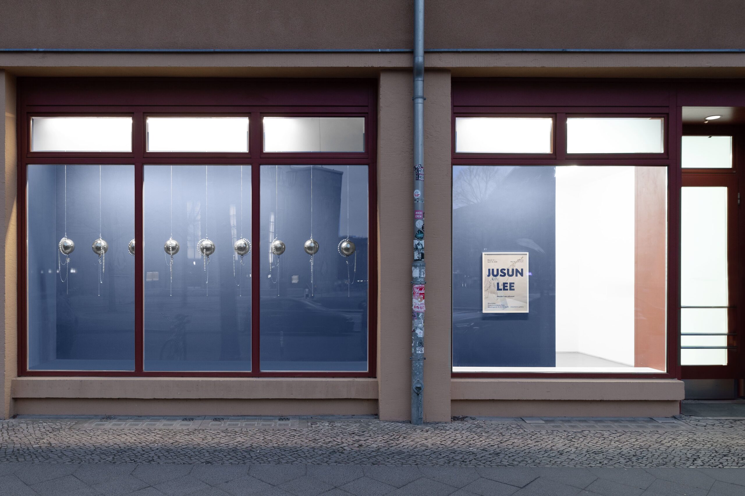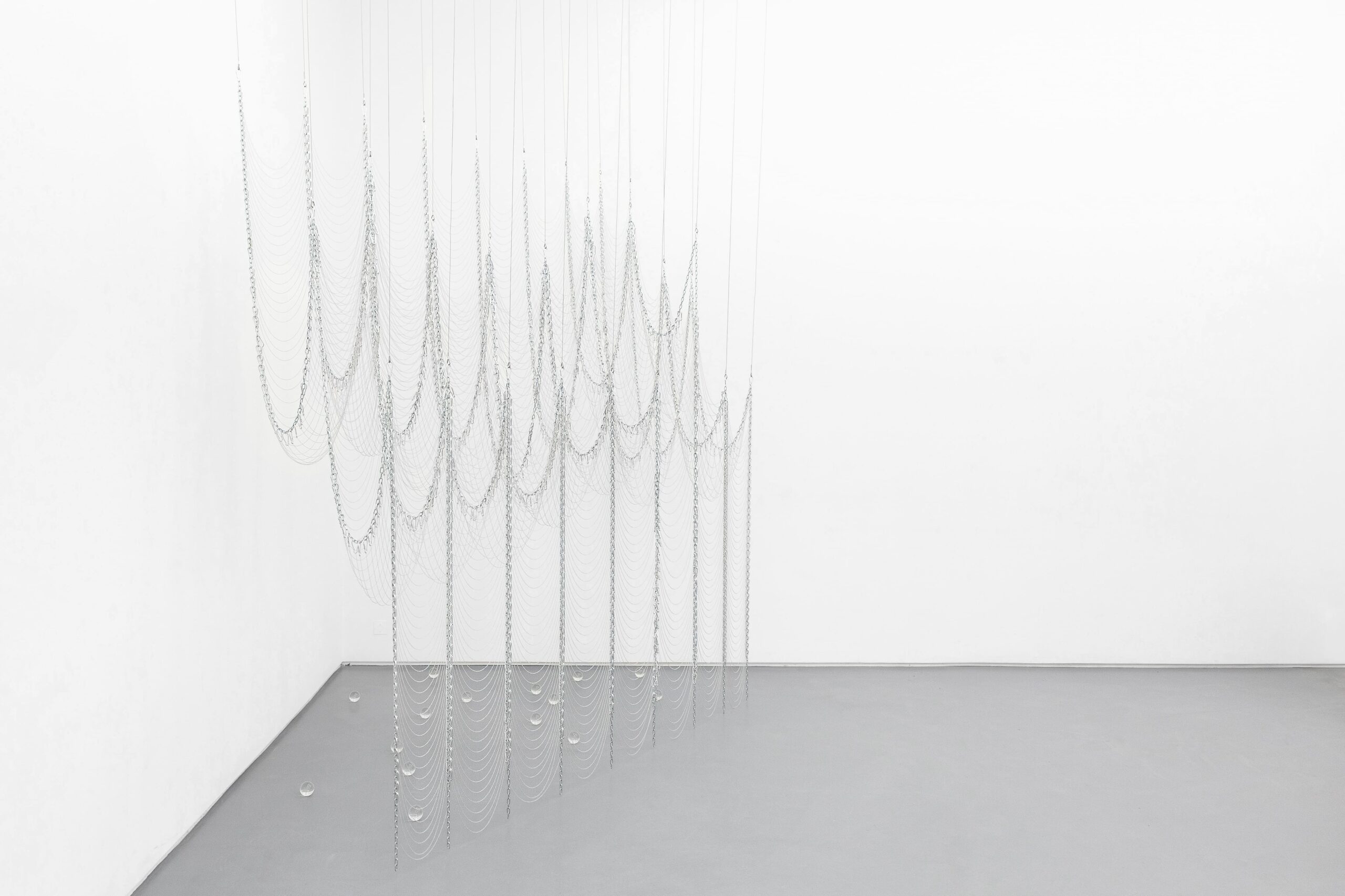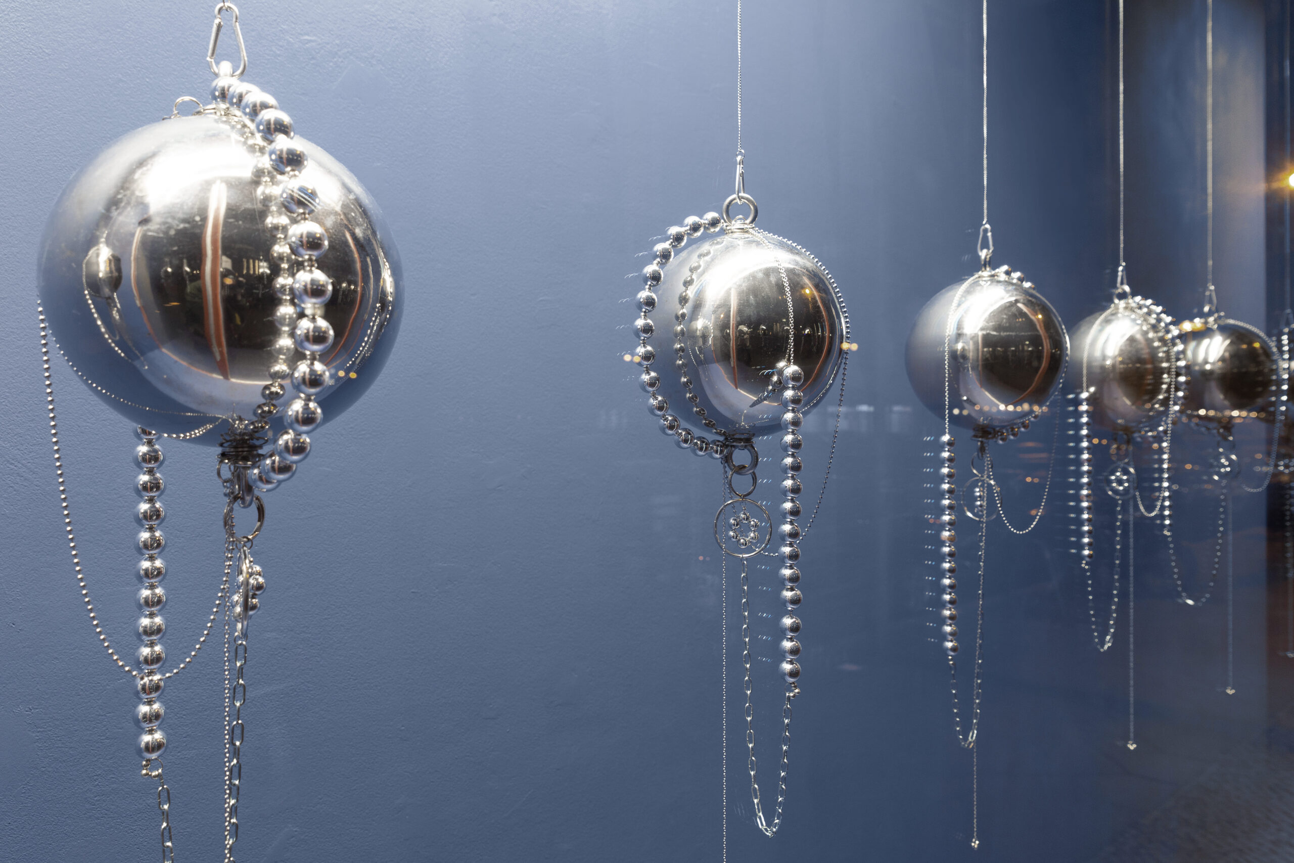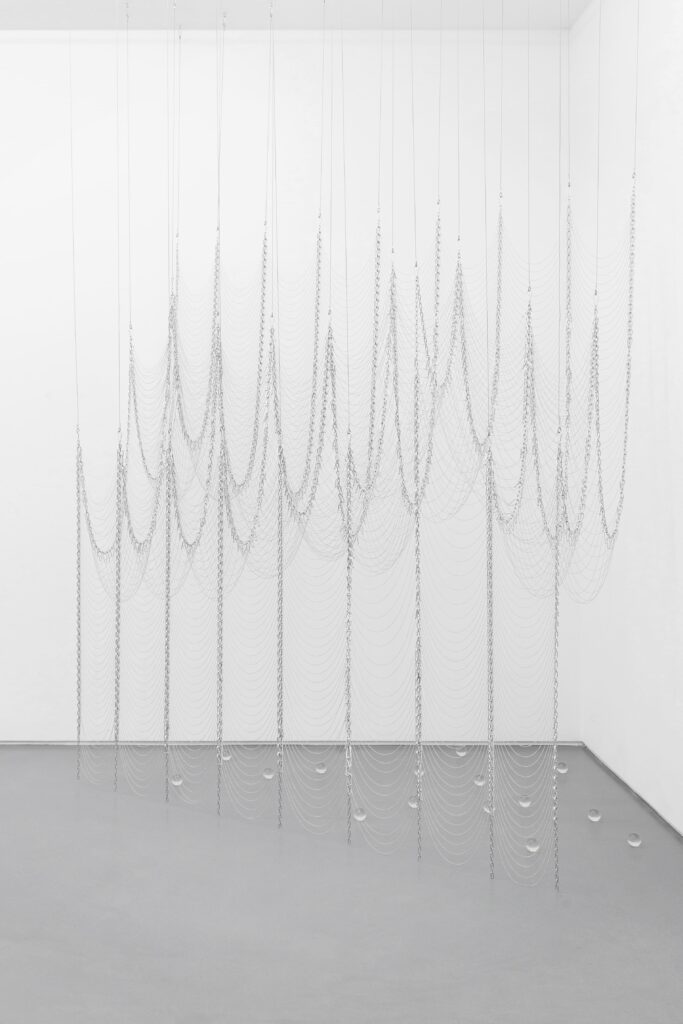 Jusun Lee, Time Lapse, 2026 · Stainless steel, acrylic beads, metal chain · 9 spheres, Ø 26 cm each, overall length either approx. 63 or 80 cm, dimensions variable