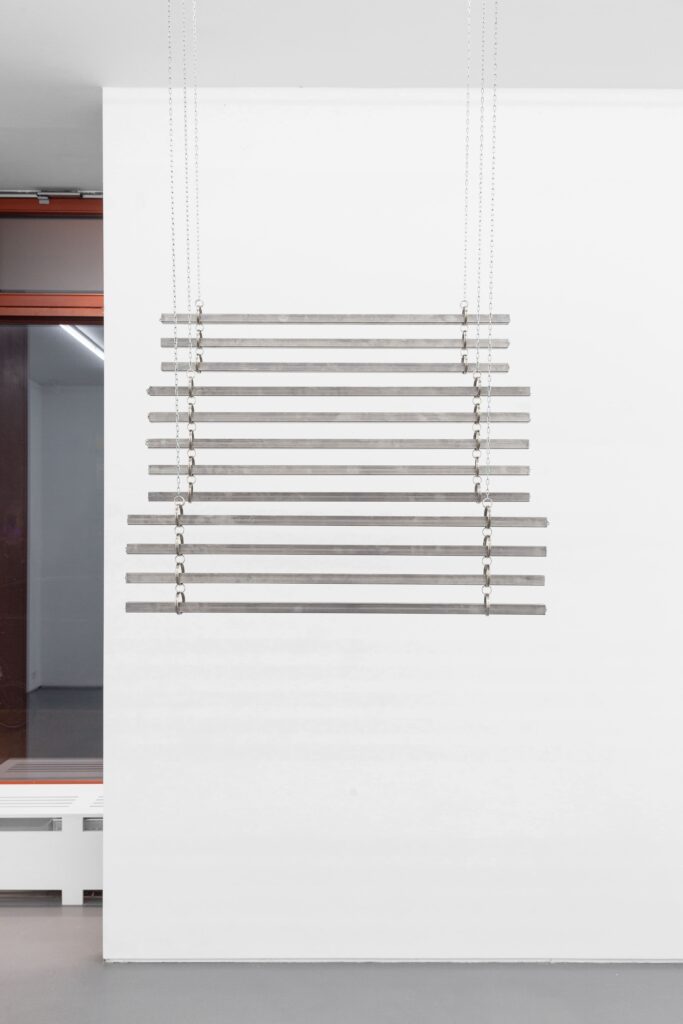 Jusun Lee, Blinds, 2026 · Stainless steel square tube, acrylic beads, metal chain · 100 × 365 × 3.5 cm