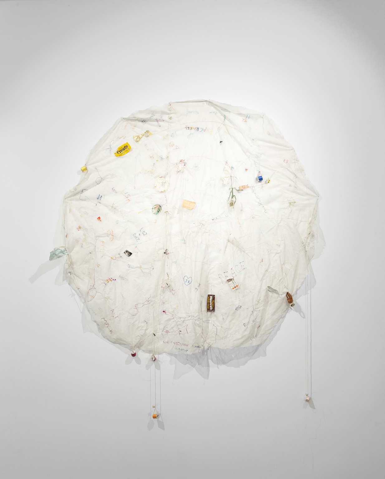 David Medalla, A Stitch in Time, 1981 (Participatory work from South Hill Park Performance Festival, Bracknell UK) · textile, thread spools, mixed media, 220 × 185 × 5 cm